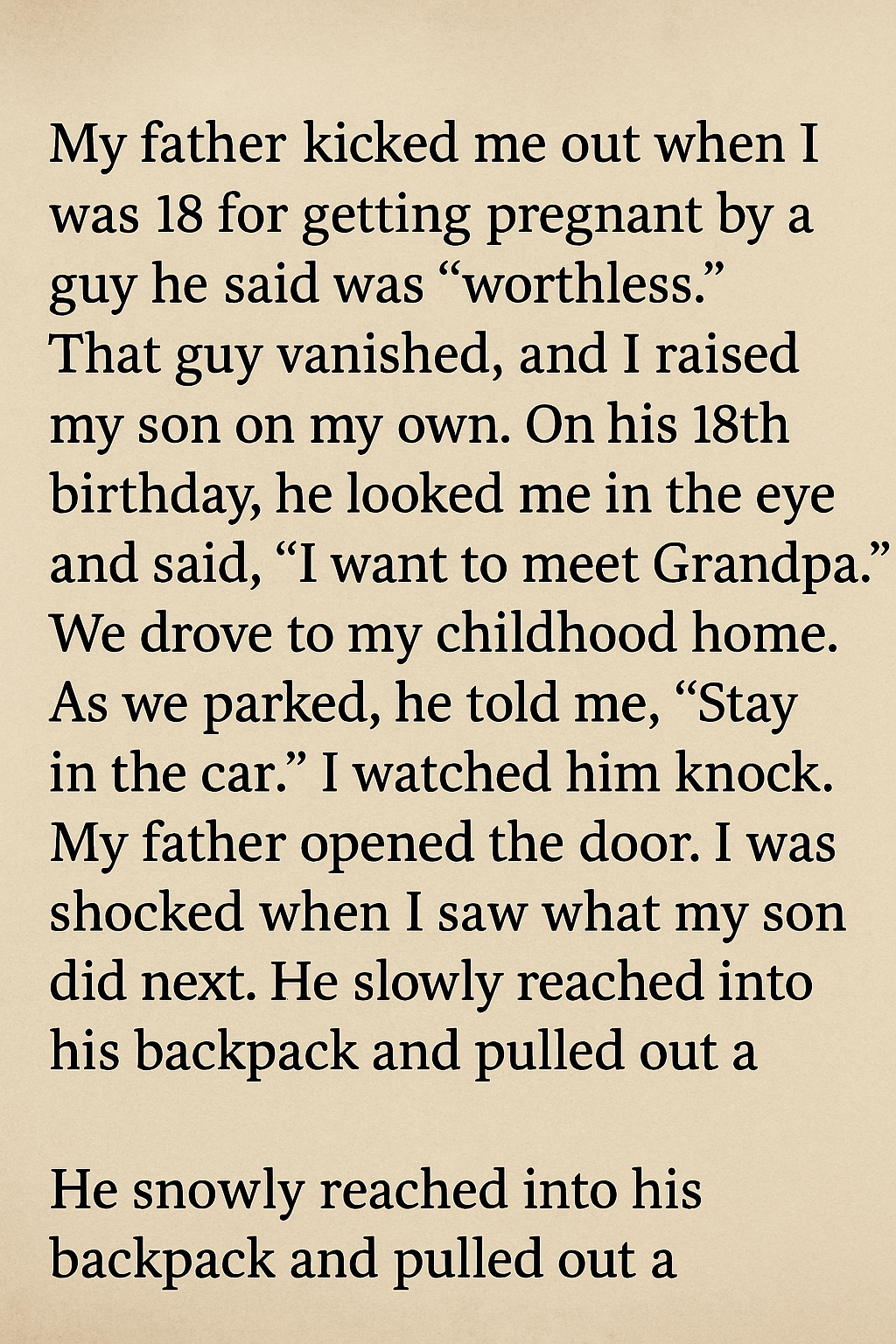 That guy vanished, and I raised my son on my own. On his 18th birthday, he looked me in the eye and said, “I want to meet Grandpa.” We drove to my childhood home.